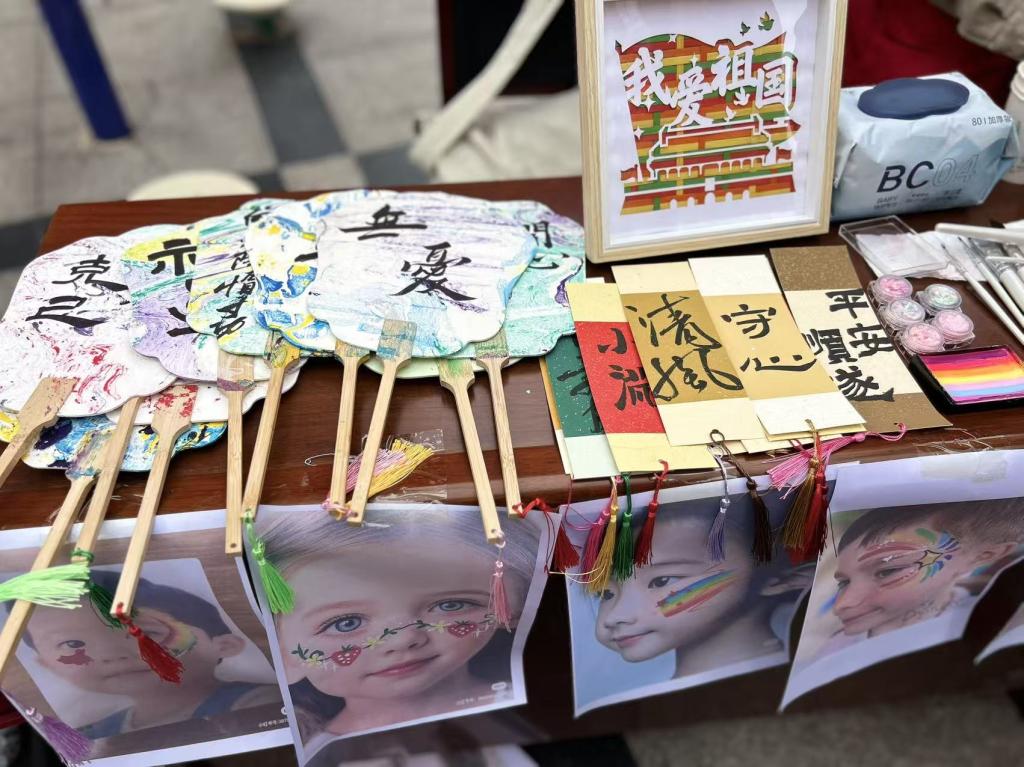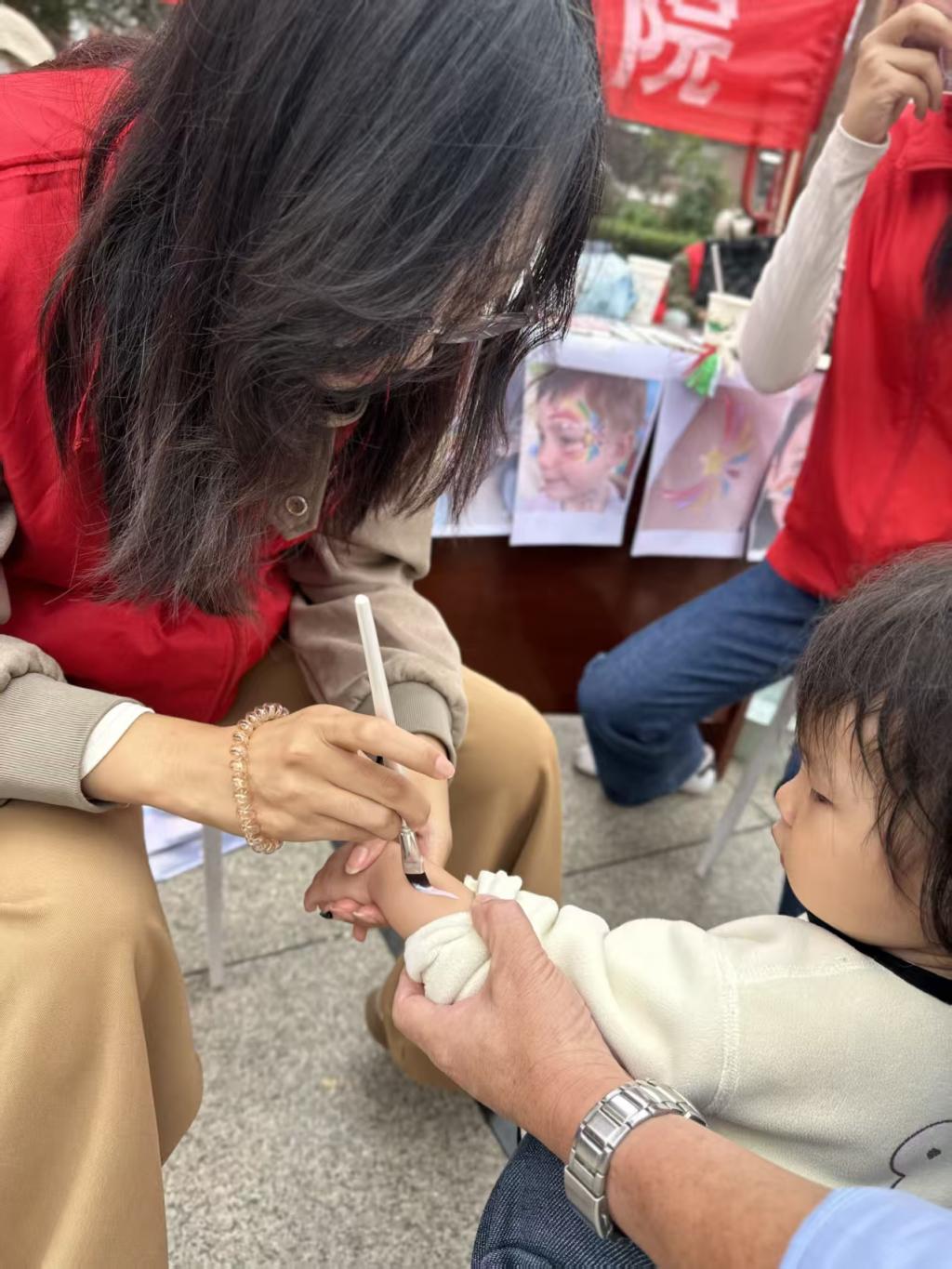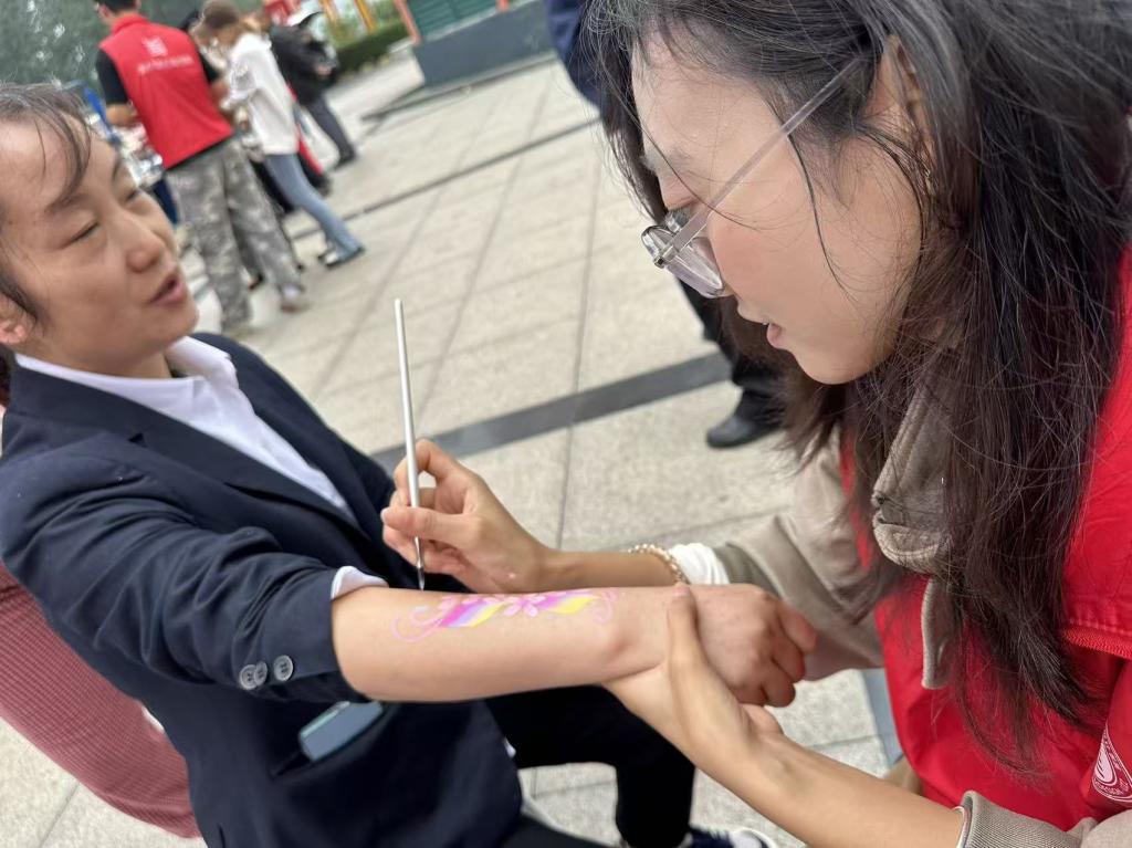 77779193永利官网集团依托社区创意集市,充分发挥美术与书法专业能写会画的特长,展示了立体纸艺、非遗剪纸、非遗漆扇、水彩画、植物书法文创、竹编画等原创手工作品50件,各类作品兼具艺术性与文化韵味,引得居民驻足观赏。同时,结合中秋、国庆双节将至的节日氛围,为社区群众进行面部和手臂彩绘活动,根据面部特征,用植物颜料,为每个居民和孩子绘制了独一无二的彩绘造型。孩子们看着镜中精致的图案,脸上满是欢喜,纷纷拉着家长拍照留念。此外,现场书写节日祝福书签赠予社区居民,进一步弘扬了中华优秀传统文化,活动现场欢声笑语不断,节日氛围与艺术气息交融。