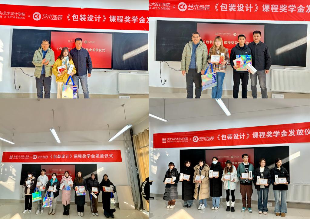 首先,谭胜兵为CK艺术包装主创设计师陈浩然、吴倩、李熙龙颁发企业导师聘书,冯大力先生为汤文广、厉相帅老师颁发企业艺术顾问聘书。随后,谭胜兵、冯大力分别为《包装设计》课程获奖同学颁发获奖证书、奖品和奖学金,现场氛围浓厚、热烈,学生深受鼓舞。最后,冯大力勉励同学们再接再厉,表示会为同学们继续提供力所能及的指导和帮助。谭胜兵做总结讲话,他充分肯定了“专业主干课程+企业(行业)”的应用型人才培养模式的成效和意义,同时也对CK艺术包装对学院教育事业的无私奉献、关心和支持表示感谢,对学生的努力也给予了高度的赞扬。奖学金发放仪式结束后,与会人员一起合影留念,并参观了《包装设计》课程结课作业展。