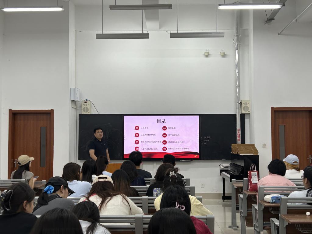 宣讲会上,征兵工作负责人孙老师对征兵政策进行了全面解读,涵盖报名条件、体检标准、入伍流程等内容,为同学们送上了一份清晰的“参军指南”。会上,孙老师着重介绍了男、女兵的报名时间节点,介绍了不同学历对应的年龄要求及相关政策,以及学费补偿、升学深造、就业安置等方面的优惠政策。宣讲会结束后,同学们纷纷表示通过此次宣讲会,对参军入伍有了更清晰的认识,坚定了投身军旅、报效祖国的决心。