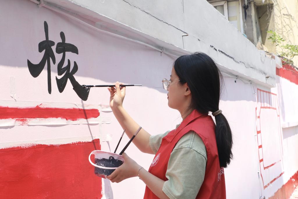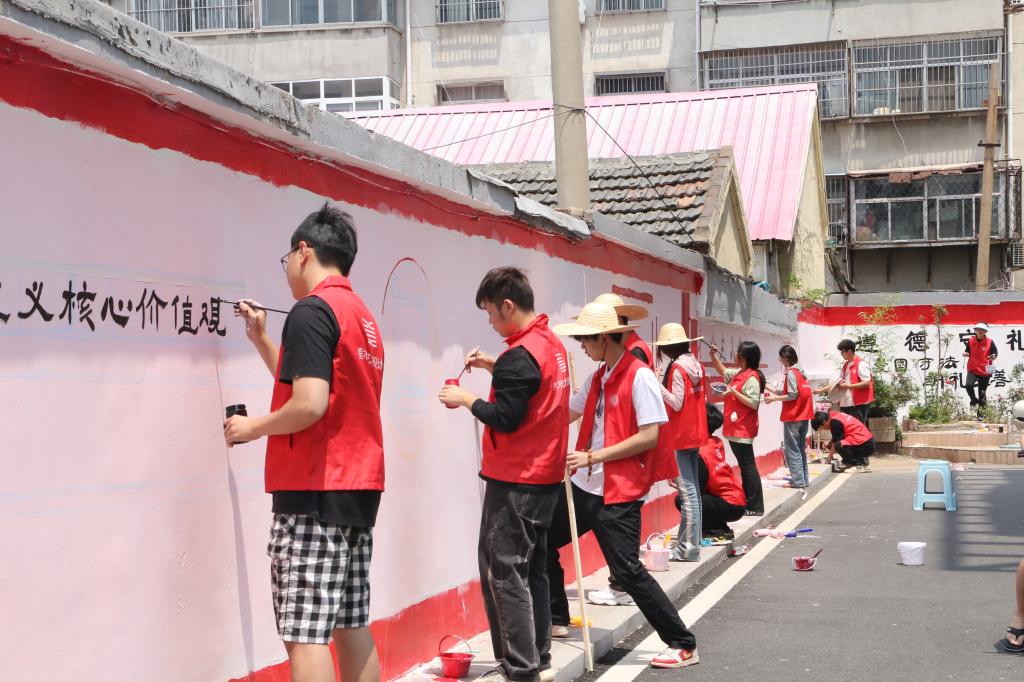本次活动志愿者们充分发挥美术专业特色社会主义核心价值观主题绘制墙体面积100㎡。绘画过程中大家分工明确、配合默契,从选择图案,到借助滚筒、板刷、丙烯、画笔等工具,通过“网格定位—轮廓勾勒—分层上色—细节精修”的标准化创作流程,将抽象的价值理念转化为具象化视觉符号,充分展现了志愿者对创作的精益求精。色彩运用上,以中国红为主色调,搭配青绿山水色系,形成兼具传统美学与当代气息的墙面。墙绘将社会主义核心价值观的宣传标语绘入到社区中,展示出了一道独具魅力的文明风景线。