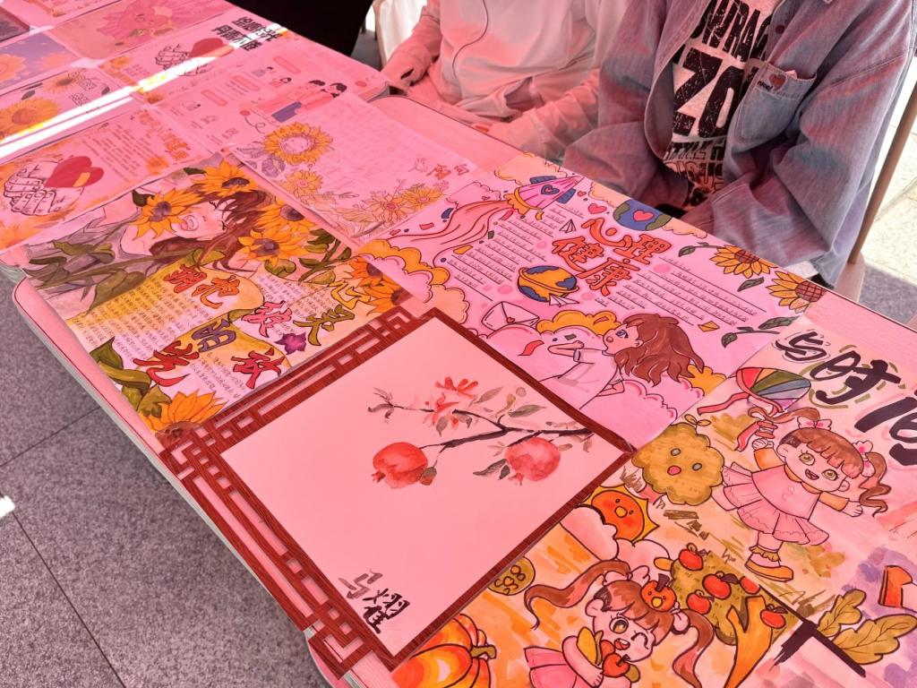活动伊始,志愿者们采用陈列法布置心理主题画作与海报,同时摆放好艺术疗愈所需的画纸、彩笔等创作工具。结合绘画艺术独特的疗愈功能,志愿者们结合心理健康教育学理论,向观展同学介绍展览的心理画作与海报,普及了情绪管理知识,构建起“视觉艺术—心理认知”的传导路径。活动现场设置了“盲盒金句”环节,同学们随机抽取写有心理关键词的卡片,将抽象心理概念转化为符号化绘画或文字创作形成具有个体心理特征的视觉化情绪图谱,展现出同学们对心理状态的独特诠释。活动尾声,参与活动的同学们将优秀作品张贴于“心灵画廊”,构建起艺术疗愈的心理文化墙。
