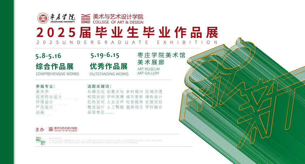 我们以艺术为纽带,将创作融入区域经济发展的脉搏,回应政府与行业的需求;从鲁南文化的深厚土壤中汲取灵感,在乡村振兴的实践中书写人文关怀。学科竞赛的磨砺、教师科研项目的深耕、跨专业选题的碰撞,让作品成为校园文化与时代命题的对话载体。无论美术学对美好时代的描绘,视觉传达设计专业对图形信息的传递,还是环境设计对生态宜居的思考,产品设计对生活美学的重构,书法对中国传统书写形式的传承与创新,还是动画对数字叙事的突破,每一件作品都承载着对社会现实的深切关注与责任担当。