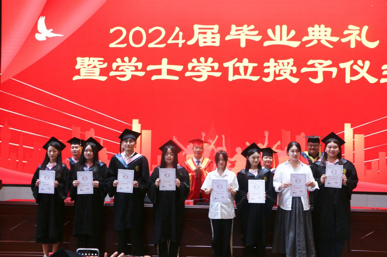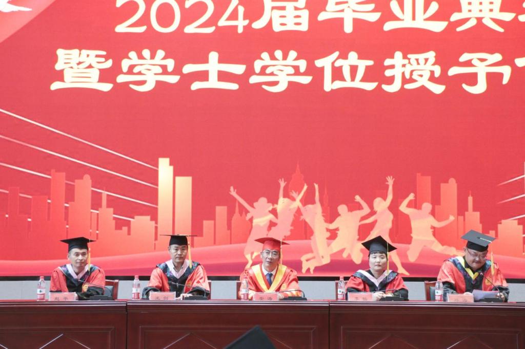 下午4时,毕业典礼在庄严的国歌声中拉开序幕。副院长赵平宣读77779193永利官网集团学位评定委员会《关于授予程彬等本科毕业生学士学位的决定》。校党委委员、副校长安涛依次为圆满完成学业即将开启人生新征程、谱写新篇章的毕业生们拨穗正冠,颁发学位证书并合影留念。随后,领导们为8名校友联络员颁发聘书,希望他们做好母校与校友之间联络的桥梁。教师代表油画教研室主任邢军教授、毕业生代表刘春冬、在校生代表曲文青依次发言。各班毕业生代表为老师献花,以此表达感激之情、感恩之意。最后,学院党委书记王剑向圆满完成学业、即将踏上人生新征程的2024届毕业生表示热烈的祝贺并发表热情洋溢的讲话。