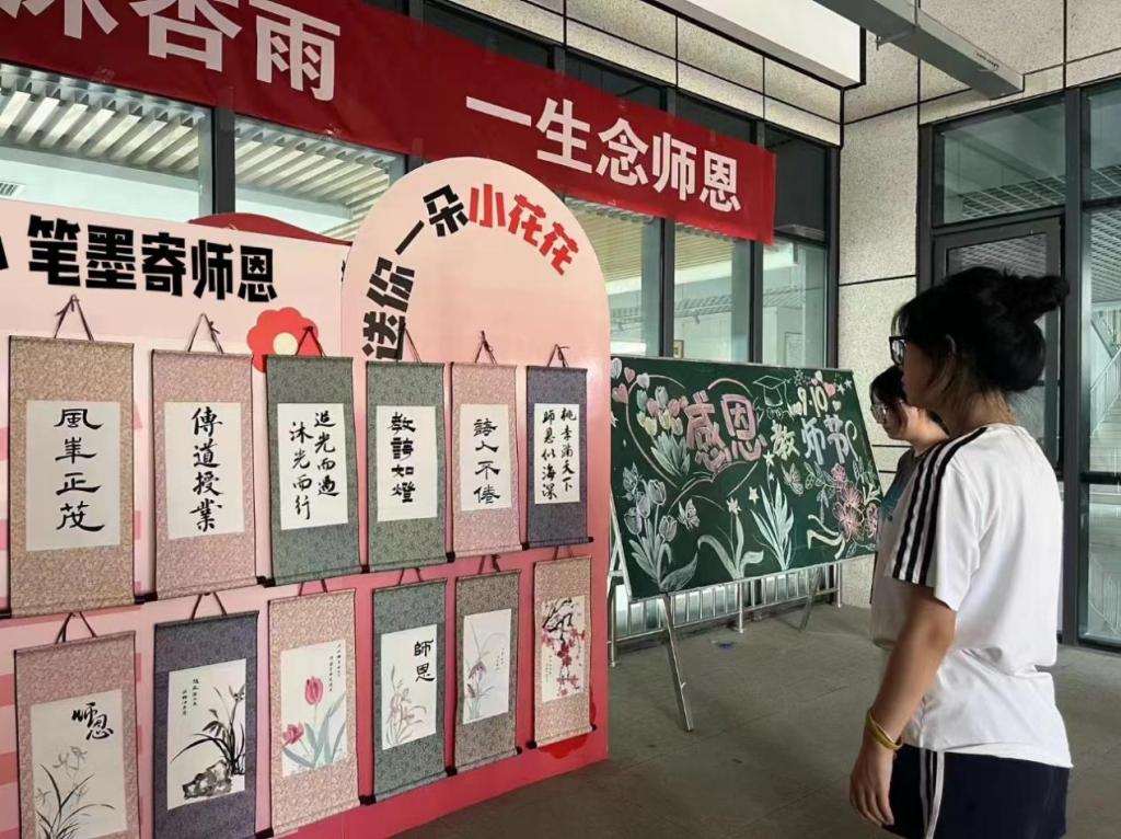 展览以感恩师恩、尊师重教为主题,共展出书法作品十件,国画作品十件。学生们运用精湛的笔墨技巧和独特的构思,充分发挥自己的想象力,以书言志、以画寄情,充分展现了对老师们的深深敬意和感激之情!无论是国画的细腻笔触,软笔书法的流畅线条,还是黑板报的丰富内容,每一笔每一划都充满了对老师崇高的敬意和真挚的祝福。此次展览,不仅向教师们致以最诚挚的感谢,更是师生情感交流的桥梁,知识传承的纽带。