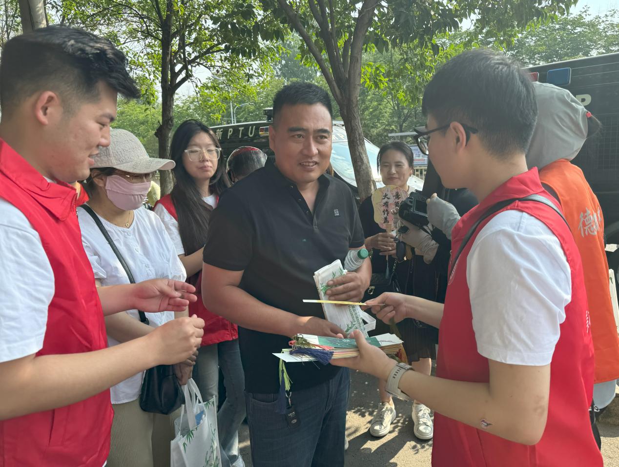 青年志愿者们在考场外设立爱心助考志愿服务点,搭建遮阳棚、拉起横幅、挂上海报、摆放桌椅,为家长、考生们提供纳凉场所,并发放爱心矿泉水,提供、口罩、纸巾等爱心物资;准备了消暑物资和免费医疗救助物品,为考生及家长提供贴心服务。志愿者们将亲手制作的漆扇和助力书签赠送给考生和家长,每一把漆扇,每一张书签都与众不同,独具特色,他们用最传统的方式,为踏上高考战场的学子们送上最真挚的祝福。