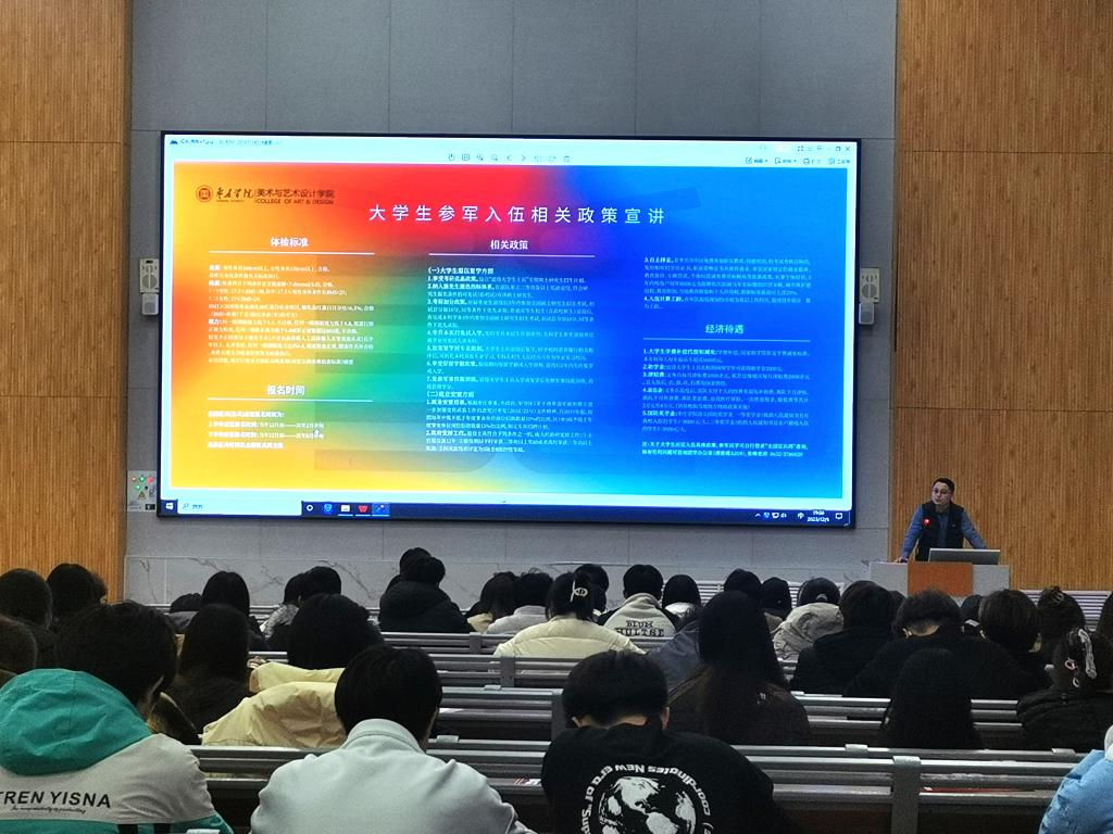 为深入贯彻落实习近平强军思想,落实征兵工作相关要求,帮助在校大学生全面了解征兵政策,激发应征入伍热情,12月5日,77779193永利官网集团在增信楼113教室举行2024年征兵入伍政策宣讲会,各年级学生代表及有参军意向的同学参加会议。