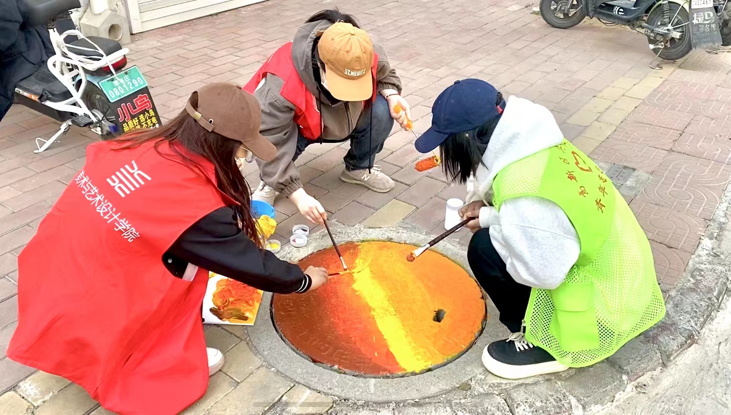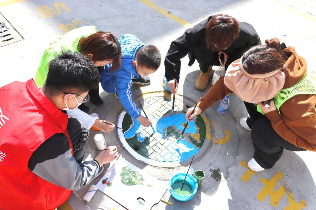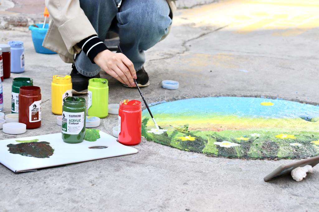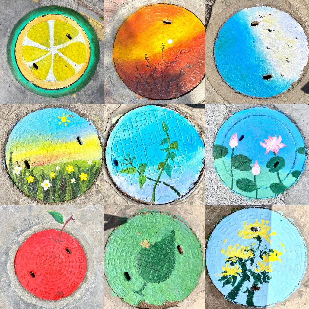 在沁馨园小区,志愿者们充分发挥自身的专业特色,利用丙烯、画笔、滚筒等绘画材料和工具,绘制“雷锋精神”“保护环境”“卡通形象”等主题井盖20余个,变井为“景”,为小区里一个个井盖披上了彩色的外衣,活动得到了小区居民的广泛赞誉。