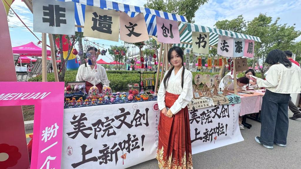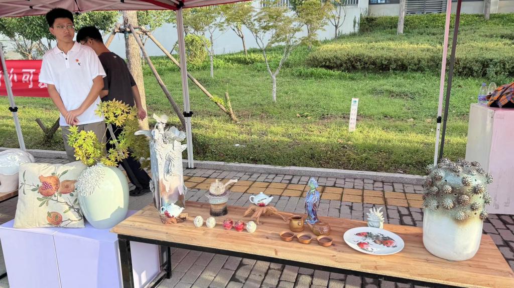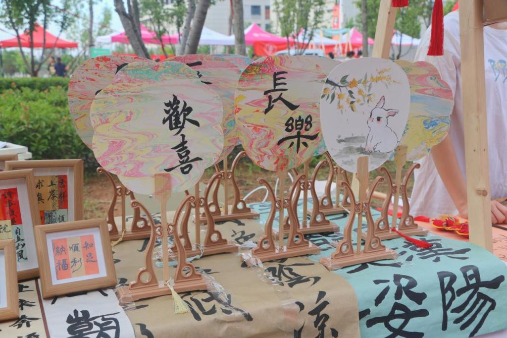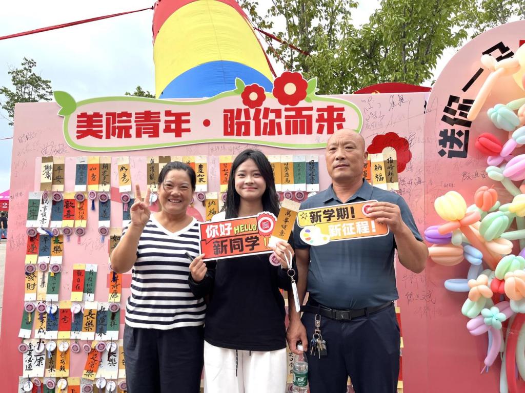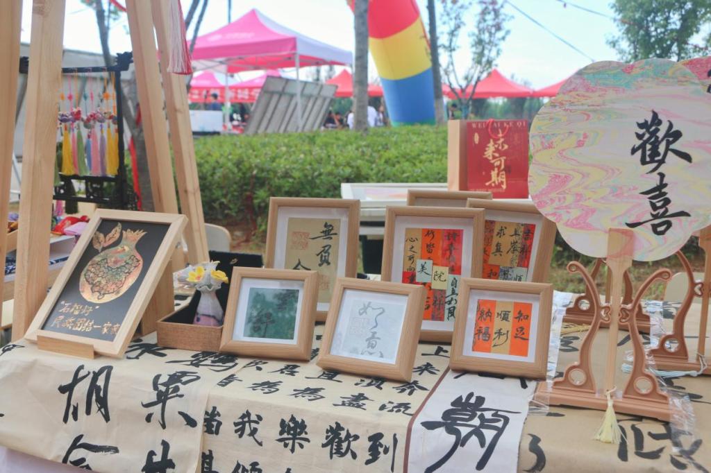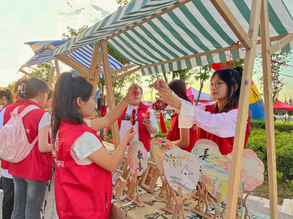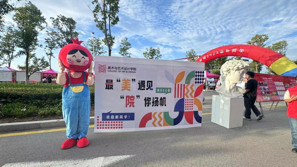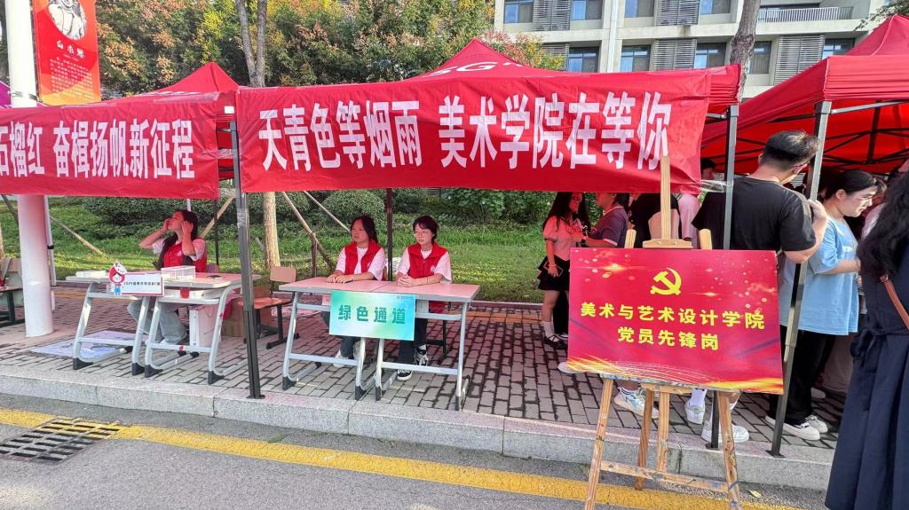 此次迎新工作,我院高度重视、精心安排,在迎新摊位和“一站式”学生社区设置党员先锋岗,并开设“绿色通道”,让党旗在迎新实践和服务中高高飘扬。志愿者们在报道现场为新生答疑解惑、搬运行李,帮助新生顺利报到入学。不仅如此,我院社团为新生准备了各类文创“开学礼物”,民间手工艺协会准备了漆扇、剪纸、书法书签等,也可以现场亲自体验漂漆扇;大地书画协会为新生准备了古风书法书签;文萃印社为新生设计了美术学院特色印章和集章明信片,不仅有枣院各个建筑、也有美院IP形象小美同学。在打卡点设置了带有新生姓名和美院LOGO的专属徽章、美院专属卡包。此外,布置了“美院上新了”文创展示区,包含石榴花发簪等非遗缠花、布艺石榴等非遗布艺、茶具等陶艺作品。