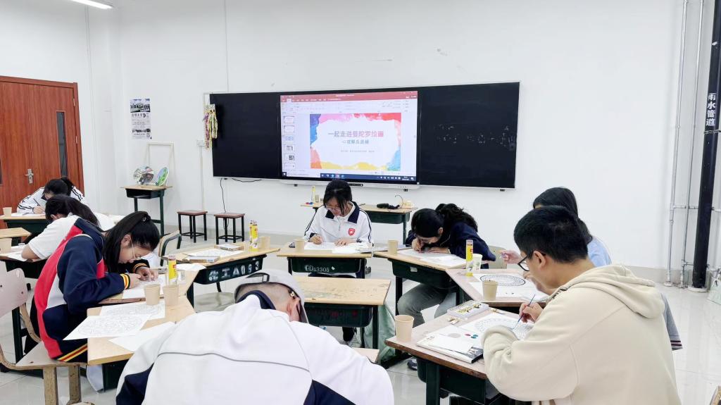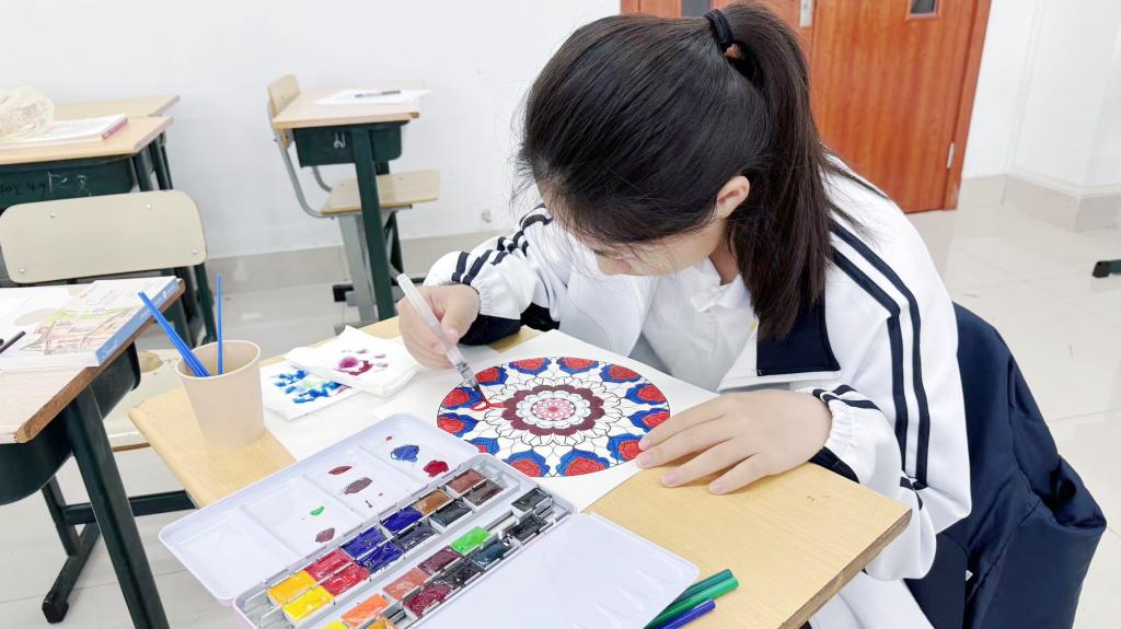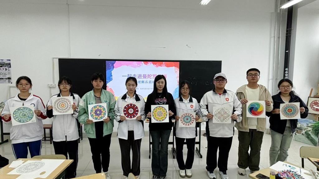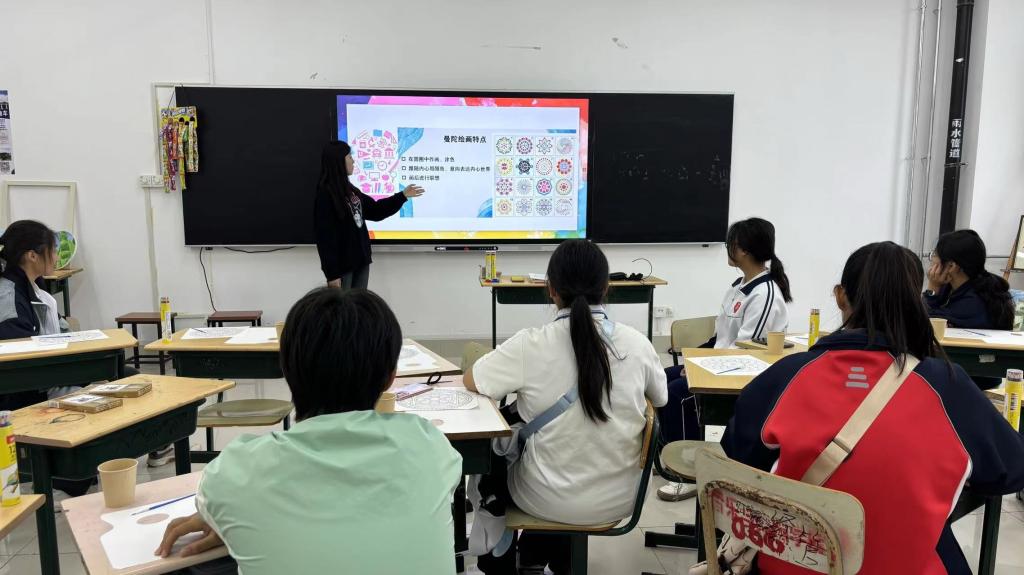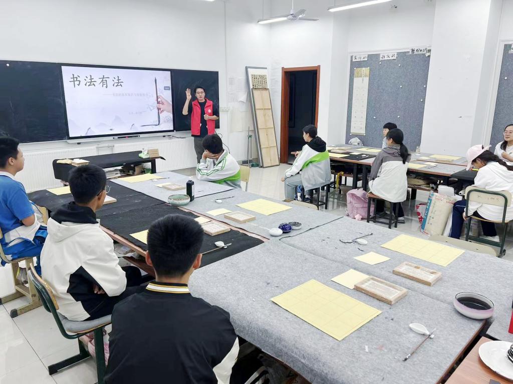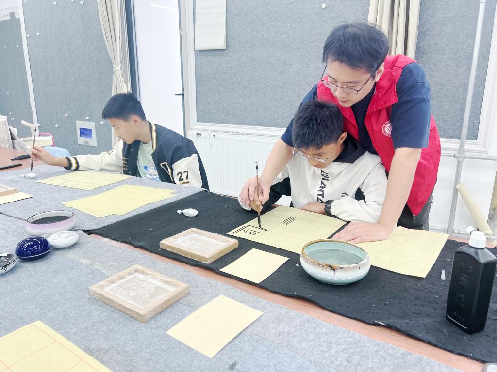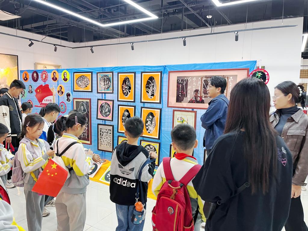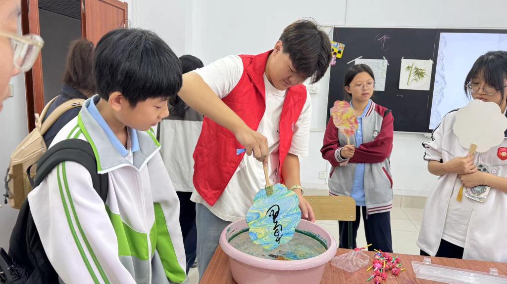 活动伊始,40余名青少年们参观了枣庄市首届教育系统美术教育作品展,通过老师们的讲解,充分了解到展览作品背后的创作理念和时代精神。参观结束后,青少年们分为小学组、初中组和高中组,学习国画知识、书法文化历史知识和绘画技巧,分别体验国画团扇、书法艺术和心理解压曼陀罗绘画。在老师和志愿者们的悉心指导下,一件件特色鲜明的非遗手工作品诞生,每一件作品都蕴含着青少年们对祖国的热爱与祝福。