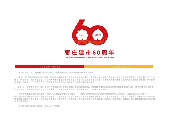 标识以数字“60”构成标识的基本造型,从标识的动势、造型元素、色彩、寓意等方面进行创意,充分体现了地域特色,融入了时代元素,突出了设计主题,作品饱满庄重,协调醒目,简洁大方,生动展现了枣庄建市60年来不忘初心、牢记使命、艰苦奋斗的光辉历程和面向未来奋勇向前的昂扬姿态。