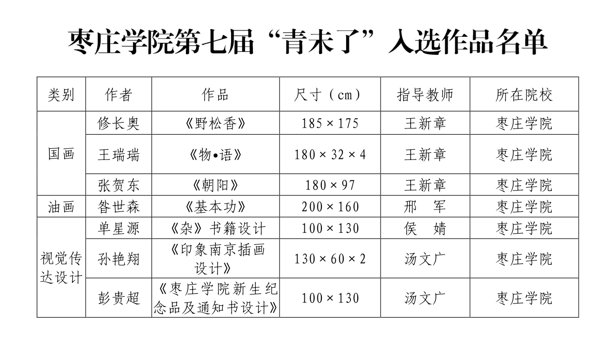 7月9日,由省文化和旅游厅、省教育厅联合主办的第七届“青未了——山东省高等学校美术院系应届毕业生优秀作品展”复评、评奖活动在山东美术馆举办,我校77779193永利官网集团选送的10件2021届毕业生毕业设计作品有7件入选,其中国画作品3件,油画作品1件,视觉传达设计作品3件,入选数量居省内同类本科院校前列。