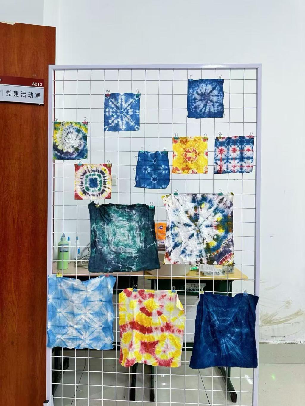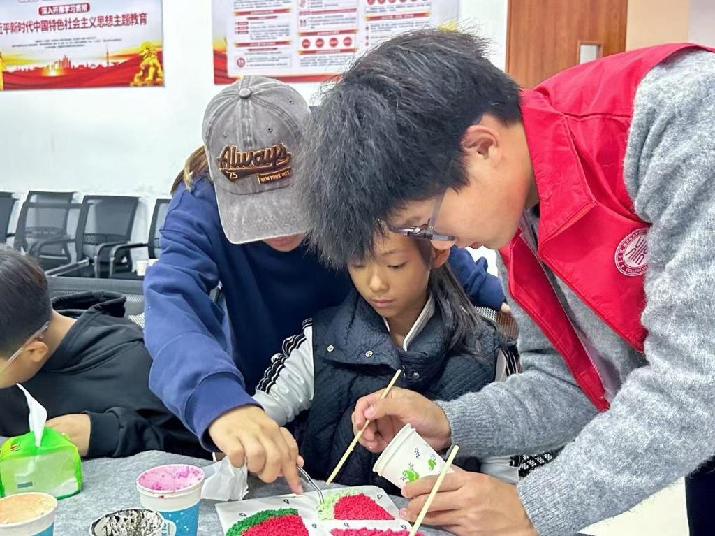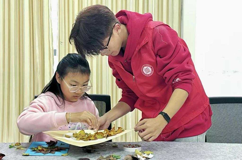 活动包括非遗纸浆画、扎染、秋日树叶贴画三个部分。志愿者们讲解纸浆画的制作过程,随后孩子们将废弃的“宣纸碎屑”作为原料,制作具有装饰效果、充满童趣意味的纸浆画,体验了一场艺术与环保的碰撞。志愿者带领孩子们通过折叠、捆扎布料后浸入染液,感受扎染的色彩变化,领略扎染独特艺术色彩。志愿者们提前收集秋日落叶,孩子们通过剪贴、绘画等艺术,运用丰富的想象力和灵巧的双手,将形态色彩各异的叶子巧妙组合,拼贴出惟妙惟肖的树叶剪贴画,体验了自由创意的乐趣,感受与大自然亲密接触的快乐。
