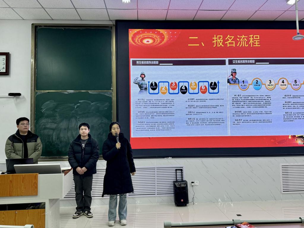 此次宣讲中,退役复学学生代表邵常振通过大学生入伍的征集条件、应征入伍报名流程、国家现行的报名指南、优惠政策以及发展路径五方面。结合自身的入伍经历,介绍了当前的国家安全形势,重点介绍了国家对于大学生入伍在学业支持方面的政策,如保留学籍、学费补偿代偿等,强调了征兵入伍对于国家的重要意义,鼓励同学们积极投身国防事业。随后,退役复学学生代表邢萍萍分享了自己的军旅生涯,讲述了在军营中度过的难忘岁月,以及与战友们并肩作战的感人故事。在互动环节,同学们踊跃提问,退役复学学生代表进行了详细解答。