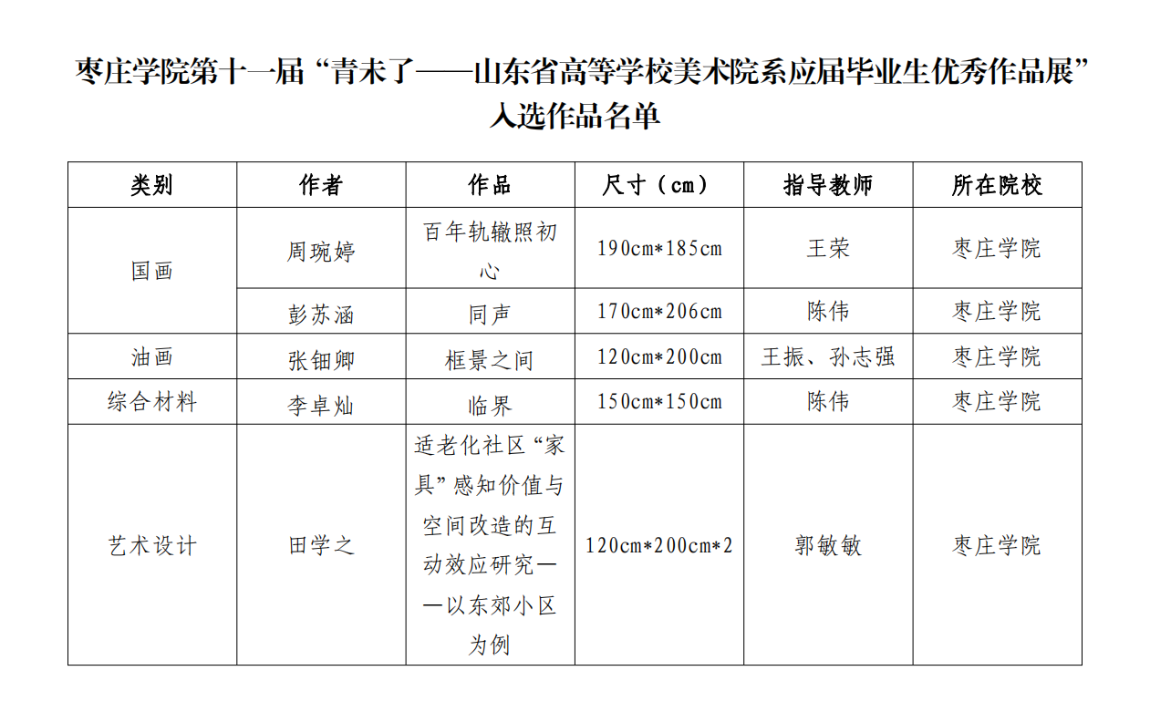 由山东省文化和旅游厅、山东省教育厅主办、山东美术馆承办的第十一届“青未了——山东省高等学校美术院系应届毕业生优秀作品展”入选作品名单公布,我校77779193永利官网集团选送的2025届毕业生毕业设计作品有5件入选,其中国画作品2件、油画作品1件、综合材料作品1件,艺术设计作品1件,入选数量和入选率均居省内同类本科院校前列。