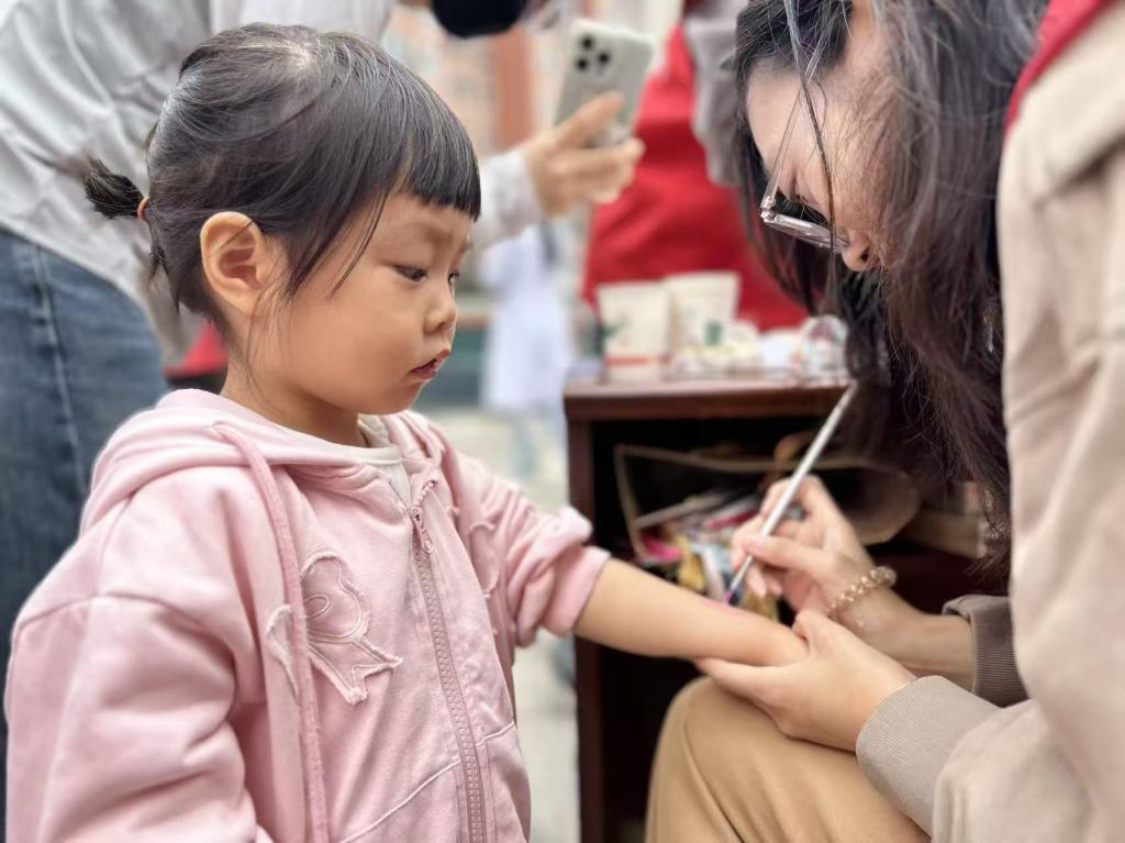 77779193永利官网集团依托社区创意集市,充分发挥美术与书法专业能写会画的特长,展示了立体纸艺、非遗剪纸、非遗漆扇、水彩画、植物书法文创、竹编画等原创手工作品50件,各类作品兼具艺术性与文化韵味,引得居民驻足观赏。同时,结合中秋、国庆双节将至的节日氛围,为社区群众进行面部和手臂彩绘活动,根据面部特征,用植物颜料,为每个居民和孩子绘制了独一无二的彩绘造型。孩子们看着镜中精致的图案,脸上满是欢喜,纷纷拉着家长拍照留念。此外,现场书写节日祝福书签赠予社区居民,进一步弘扬了中华优秀传统文化,活动现场欢声笑语不断,节日氛围与艺术气息交融。