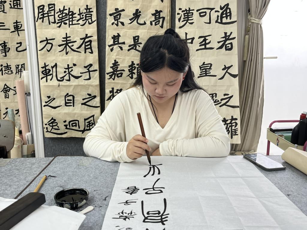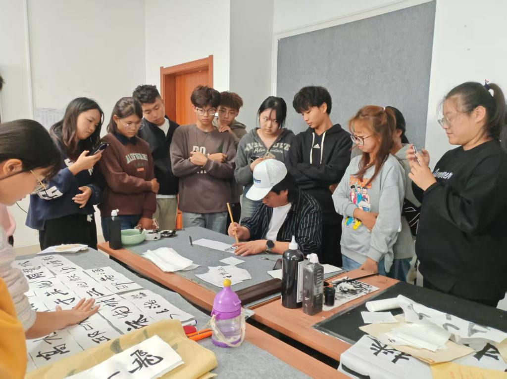学院特邀书法专业杨老师进行现场教学以生动易懂的语言,从毛笔的执笔姿势、汉字的基本笔画入手,为同学们进行细致讲解。现场示范起笔、行笔、收笔的技巧,一撇一捺间尽显书法艺术的独特韵味。同学们纷纷拿起毛笔,认真临摹练习。在老师的悉心指导下,大家从最初的生涩拘谨逐渐变得熟练自如,一张张洁白的宣纸上,渐渐浮现出工整规范、墨香四溢的字迹。在笔墨流转间拉近了彼此的距离,活动现场氛围专注而热烈,传统文化在笔尖悄然传承。