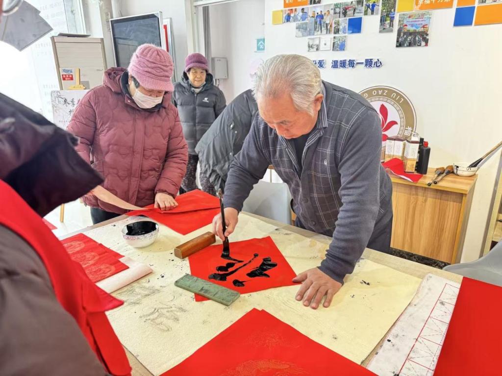 活动现场,志愿者备好笔墨纸砚、铺展红纸,书写寓意吉祥的春联与“福”字,寄寓家国安康、生活幸福的美好祝愿。现场创作之余,志愿者们还热情邀请社区居民参与传统书法创作,耐心指导社区居民握笔、运笔技巧,让其亲身感受汉字与书法艺术的独特魅力。书写完成后,志愿者们走访社区,将满载心意的春联与“福”字送到居民手中,在亲切的交流中传递新春温暖与关怀。活动尾声,志愿者们细心整理打扫场地,并与社区工作人员、居民手持春联合影留念,定格这场兼具文化气息与社区温情的美好瞬间。
