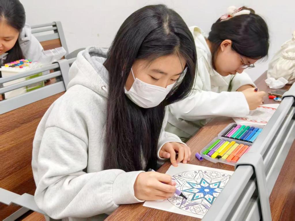 活动进入自行创作阶段,同学们专注于笔尖与色彩,将当下的思绪与情感全部倾注于作品当中,在沉浸式体验中有效疏解了压力,提升了心理调适能力。